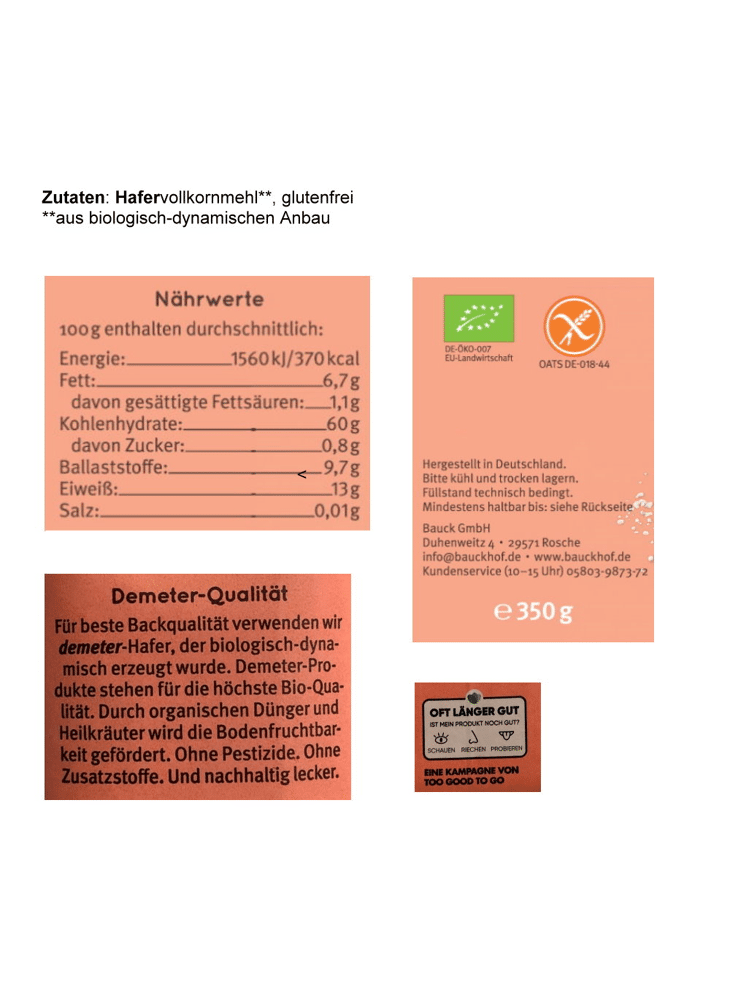 Haver is overigens van nature glutenvrij. Dat geldt ook voor onze haver uit de biologisch-dynamische teelt. Al meer dan 10 jaar zorgen we er samen met onze partnerboeren voor dat we gecontroleerde glutenvrije producten kunnen aanbieden. Het begint al op het veld. Dan komt de biologische haver naar onze Bauckhofmolen en wordt hier met veel kennis en ervaring gemalen. Elke batch wordt opnieuw grondig gecontroleerd in ons laboratorium. We kunnen er dus echt zeker van zijn dat onze havermout biologisch EN glutenvrij is.