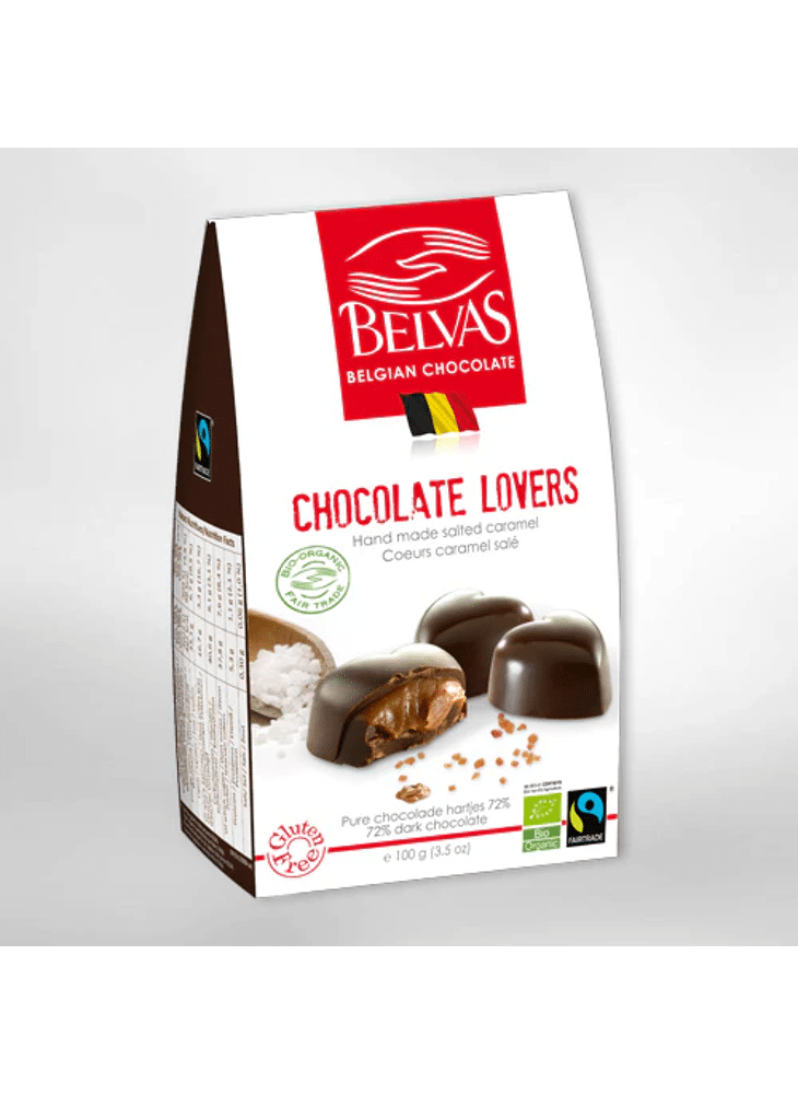 Belvas 72% pure chocolade hartjes met licht gezouten, zelfgemaakte karamel.