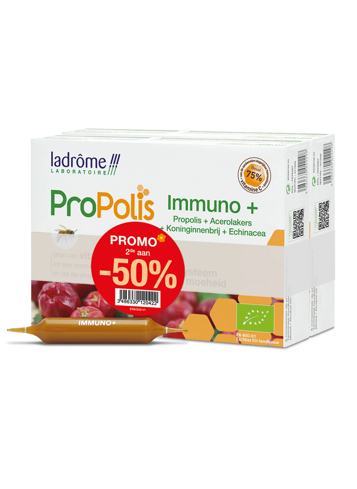 Bio voedingssuplement met Propolis, planten en nutriënten Immuno+ is een complex uit het hart van de natuur dat de waardevolle bijenproducten Propolis en koninginnenbrij combineert met zowel een extract als het verse plantensap van echinacea. Het bevat eveneens acerolakers als bron van natuurlijke vitamine C die bijdraagt tot een normale functie van het immuunsysteem. Eén ampul Immuno + voert 75 % aan van de dagelijkse aangeraden hoeveelheid Vitamine C, dat bijdraagt tot een normale functie van het immuunsysteem en tot de afname van vermoeidheid en moeheid.