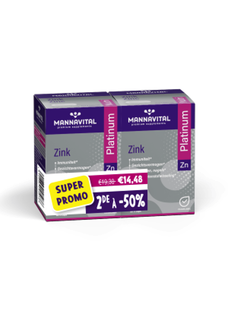 Het mineraal zink speelt een belangrijke rol in heel wat lichaamsprocessen: vooral op het vlak van weerstand, gezichtsvermogen, vruchtbaarheid, koolhydratenstofwisseling en integriteit van huid, haren en botten. Dit is al een behoorlijke lijst en een goede zinkbalans is dus cruciaal voor een gezond lichaam! Tegelijk kunnen we stellen dat een westers dieet, rijk aan suiker en geraffineerde voedingsmiddelen, vaak een zinkgebrek vertoont. Met ZINK PLATINUM bestaat een 'gecheleerde' en dus goed opneembare vorm van zink, die de opname van andere mineralen (zoals koper) niet remt en bovendien goed verdragen wordt.