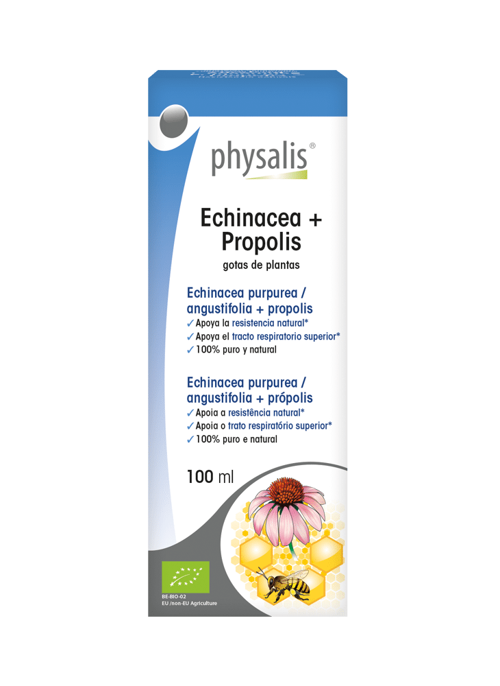 Onze natuurlijke weerstand krijgt het dagelijks hard te verduren door stress, slechte weersomstandigheden, vermoeidheid... en noem maar op! Daarom is er Physalis Echinacea + Propolis bio om jou te helpen! Deze plantendruppels bevatten echinacea die de natuurlijke weerstand en het comfort van de bovenste luchtwegen ondersteunt. Propolis is een wasachtige substantie die bijen aanmaken uit het hars van verschillende knoppen van bomen om hun nest te beschermen tegen slecht weer of andere invloeden van buitenaf; op dezelfde manier kan het ook jou helpen!