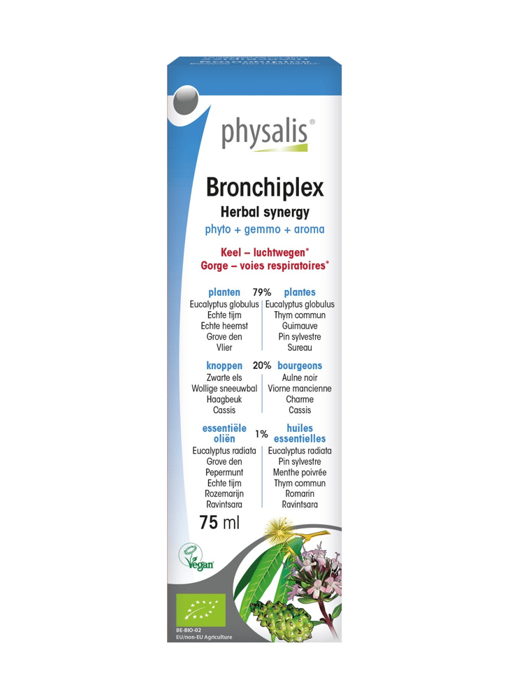 Heb je soms last van geïrriteerde luchtwegen, waardoor gewoon ademen zelfs pijnlijk aanvoelt? Physalis Bronchiplex bio is er voor jou! Deze druppels bevatten eucalyptus, echte tijm, echte heemst, grove den, vlier en wollige sneeuwbal die een verzachtende invloed hebben op de keel en de luchtwegen en helpen om vrijer te ademen.