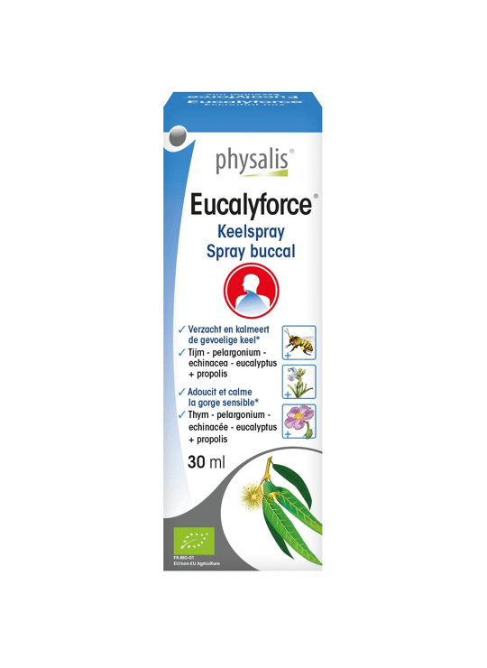 Ervaar zelf de verzachtende kracht van eucalyptus! Physalis Eucalyforce® keelspray bio is een 100% natuurlijke spray op basis van propolis, plantenextracten en essentiële oliën. Tijm, groot kaasjeskruid, echinacea, eucalyptus en munt hebben een verzachtende invloed op de luchtwegen en verzachten de keel.