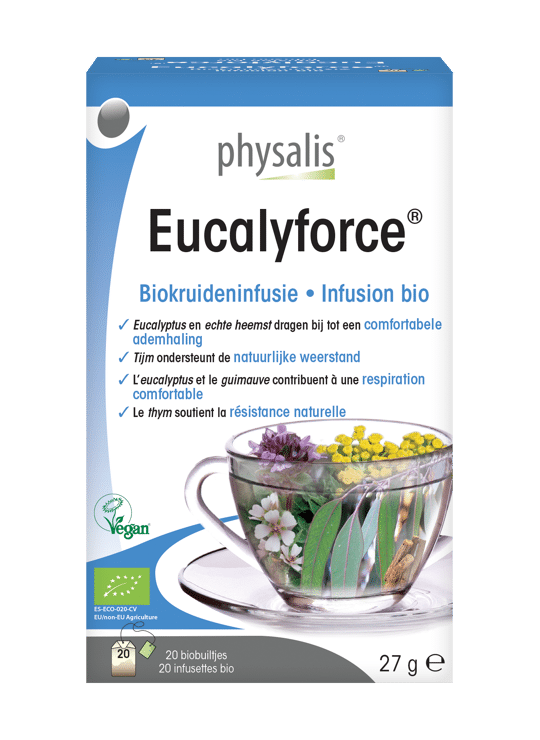 Koude, wind, regen, luchtvervuiling,… onze luchtwegen krijgen heel wat te verduren. Gelukkig is er Physalis Eucalyforce® biokruideninfusie. Deze heerlijke thee bevat eucalyptus en echte heemst die bijdragen tot een comfortabele ademhaling en tijm die de natuurlijke weerstand ondersteunt. Heerlijk op een koude winteravond, met of zonder honing. Voel de weldadige kracht van eucalyptus!