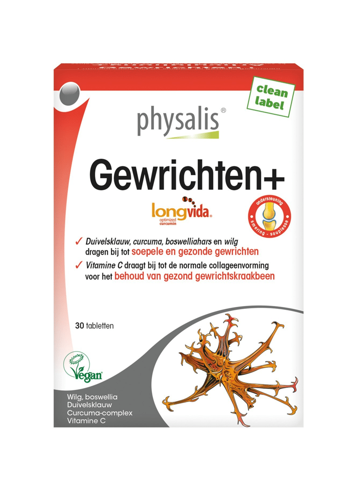Gedaan met die stramme gewrichten, voel je weer soepel zoals weleer! Physalis Gewrichten+ is een hoogwaardig complex met extracten van het hars van wierookboom en duivelsklauw, beiden gekend voor hun bijdrage tot de soepelheid van de gewrichten. Deze werking wordt bovendien nog verder ondersteund door het toegevoegde wilgen- en kurkuma-extract, die beiden ook de flexibiliteit en gezondheid van de gewrichten bevorderen. De extra vitamine C helpt je lichaam dan weer met het behoud van gezond gewrichtskraakbeen.