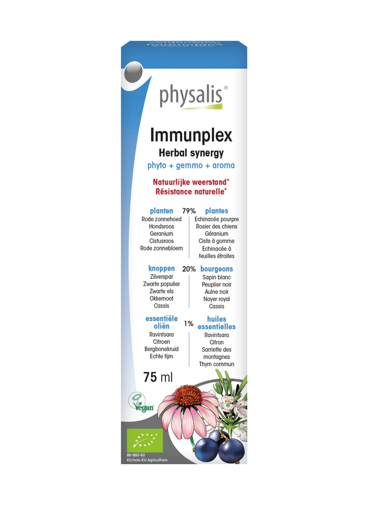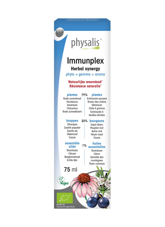 Geef je natuurlijke weerstand een ongeziene boost! Physalis Immunplex bio bevat onder andere echinacea, hondsroos, zwarte els, bergbonenkruid en echte tijm die je immuunsysteem ondersteunen en natuurlijke bescherming bieden. Immunplex bundelt alle actieve bestanddelen van de planten in één hoogwaardig en actief complex.