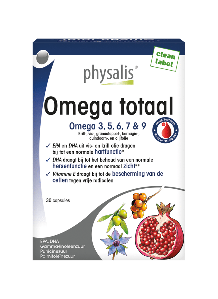 Van de alfa tot de omega: deze tabletten bevatten alle omega-vetzuren die je nodig hebt! Physalis Omega Totaal voorziet je van een volledig spectrum van alle omega-vetzuren van mariene en plantaardige oorsprong. Physalis Omega totaal is een subliem complex van 5 omega-vetzuren afkomstig uit hoogwaardige visolie, krillolie en uit planten zoals bernagie, duindoorn, granaatappelzaad en olijven. De essentiële omega 3-vetzuren uit vis- en krillolie dragen bij tot een normale hartfunctie, de instandhouding van een normaal zicht en een gezonde hersenfunctie.