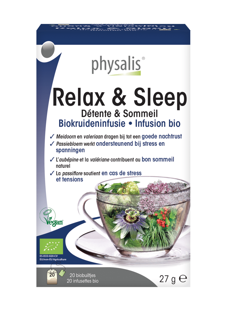 Kan je 's avonds maar moeilijk in slaap vallen? Of lig je 's nachts altijd maar te piekeren? Dan is Physalis Relax & Sleep biokruideninfusie precies wat je nodig hebt, want iedereen verdient een gezonde nachtrust! Deze zachte en aangenaam smakende thee bevat valeriaan, passiebloem, meidoorn, citroenmelisse... Allemaal planten die ondersteunend werken bij stress en spanningen door hun zalig ontspannende werking. Daarnaast dragen ze op natuurlijke wijze bij tot een goede, gezonde nachtrust. Er is niets aangenamer dan goed uitgerust, opgewekt en boordevol energie aan de dag te beginnen!