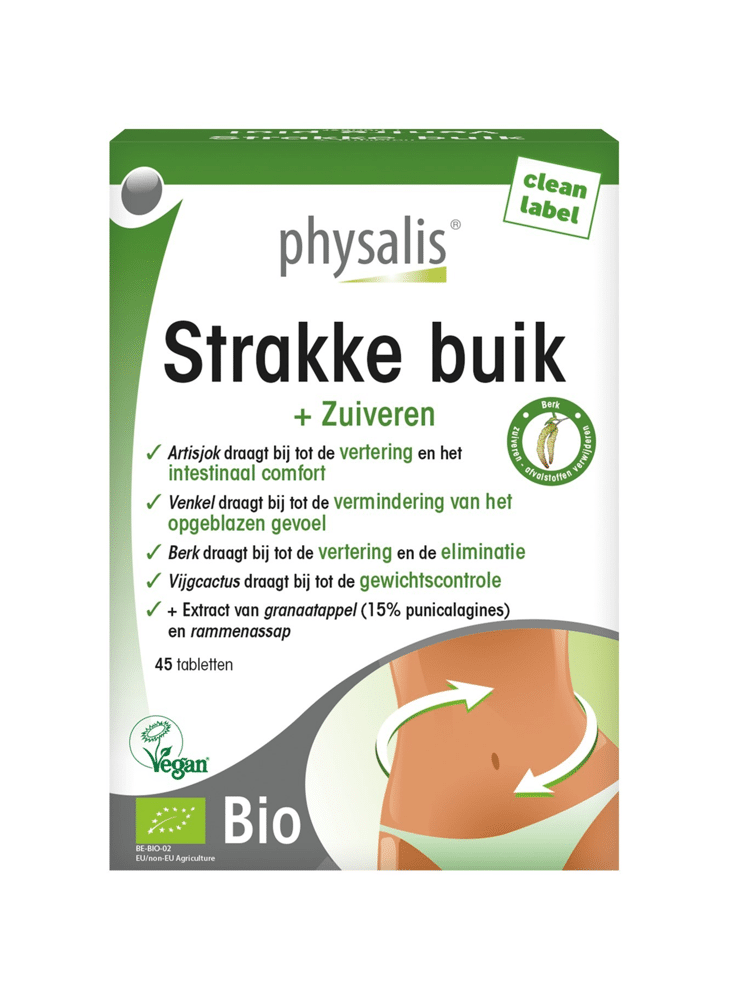 Heb je soms last van een opgeblazen gevoel? Dan is Physalis Strakke buik bio iets voor jou! Deze complete formule met hoogwaardige extracten van biologische planten bevat onder andere artisjok, dat bijdraagt tot de vertering en een comfortabel buikgevoel, terwijl venkel bijdraagt tot de vermindering van het opgeblazen gevoel. Berk ondersteunt dan weer de spijsvertering en het extract van vijgcactus helpt de gewichtscontrole. Een waar plezier voor jou én je buik!