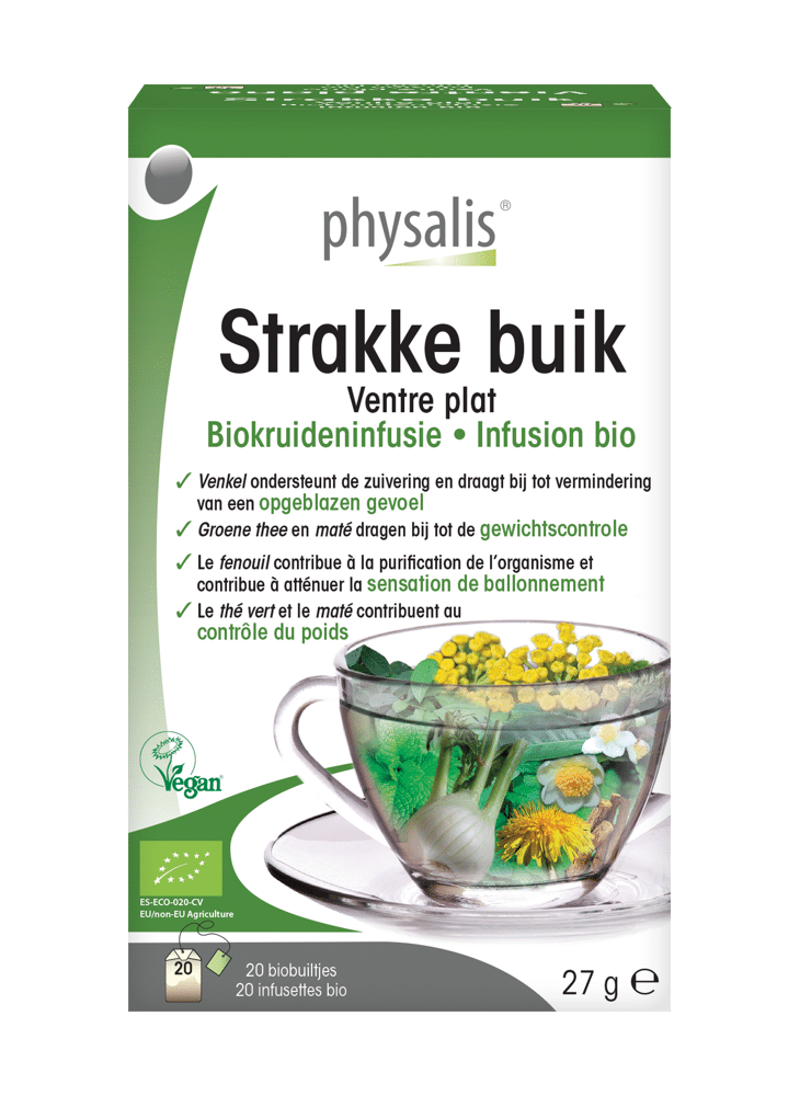 Heb je soms last van een opgeblazen gevoel? Dan is Physalis Strakke Buik biokruideninfusie precies wat je nodig hebt! Deze kruidenthee bevat venkel die de zuivering ondersteunt en bijdraagt tot de vermindering van het opgeblazen gevoel en zwelling van de buik. Citroenmelisse, munt en paardenbloem ondersteunen een goede spijsvertering. Groene thee en maté ondersteunen de vetverbranding en dragen bij tot de gewichtscontrole. En al die voordelen worden ook nog eens gecombineerd met een zachte en aangename smaak!
