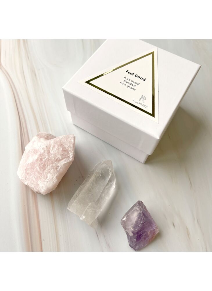 Je hebt nu jouw ultieme Feel Good Box in handen. De combinatie van Amethist, Bergkristal en Rozenkwarts staan ook wel bekend als de Gouden Driehoek. De power van de Rocks versterken elkaar en geven de perfecte vibes af in huis. En ze zien er ook nog eens mega tof uit!!