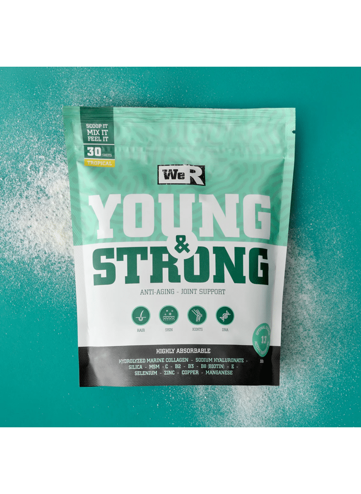 Meer rimpels, futloos haar en zwakke gewrichten? Yup, you’regetting older! Enter We’R Young & Strong. Deze mix van 13 zorgvuldiggeselecteerde ingrediënten, zoals collageen en hyaluronzuur, bevat all the goodstuff waarmee je jouw lichaam ondersteunt in het herstel- enverouderingsproces. Ready to feel young and strong?