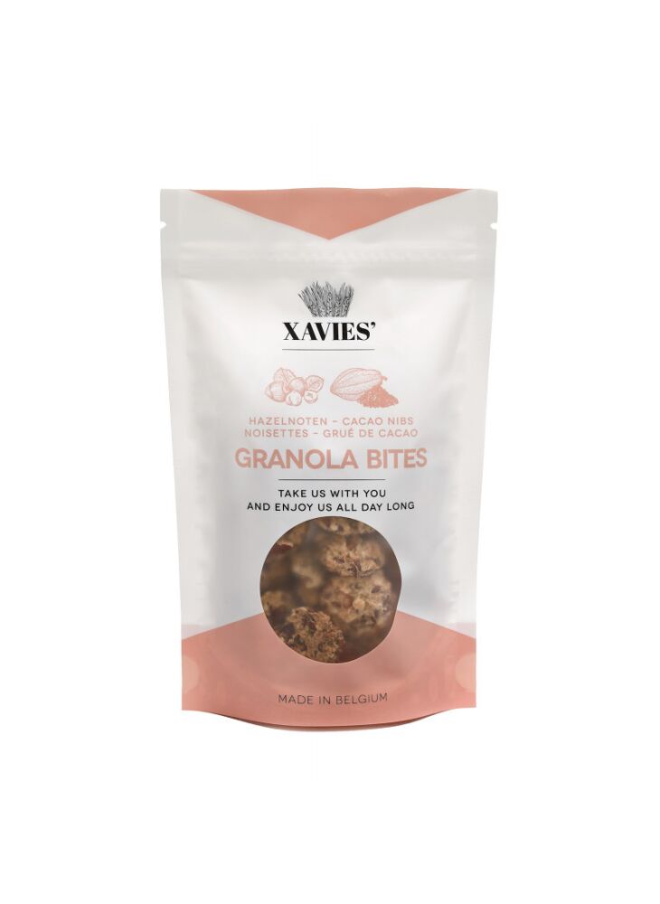 Op zoek naar een gezonde snack om de kinderen mee te geven naar school? Of om gewoon lekker zelf van te snoepen? XAVIES' Granola Bites met Hazelnoot en cacao nibs is hét ideale tussendoortje: lekker en toch gezond! Heerlijk krokant geroosterd met een lichte cacaotoets!