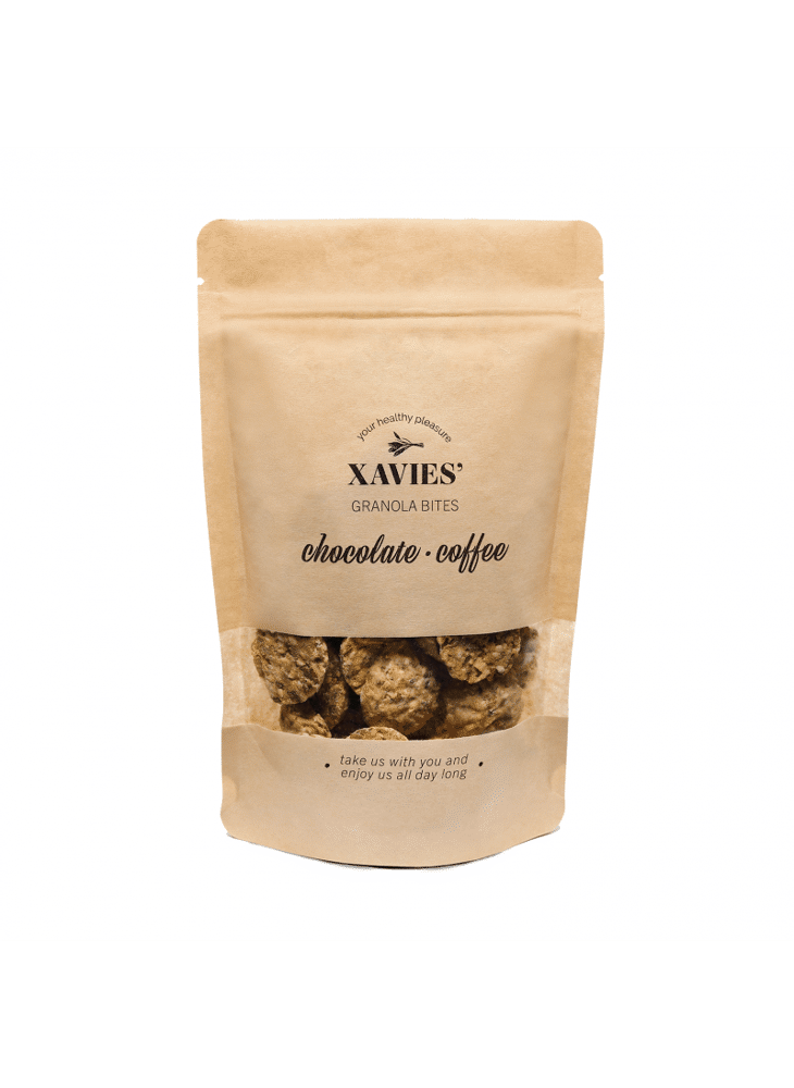 Jouw dagelijkse bron aan energie in een echt espresso-smaakbommetje! XAVIES' Granola Bites met koffie en chocolade is de ideale snack wanneer je nood hebt aan een gezonde energieboost. Geniet van de heerlijke combinatie van gemalen koffiebonen, pure chocoladedruppels en geroosterde hazelnoten, allemaal in deze krokant gebakken granolakoekjes!