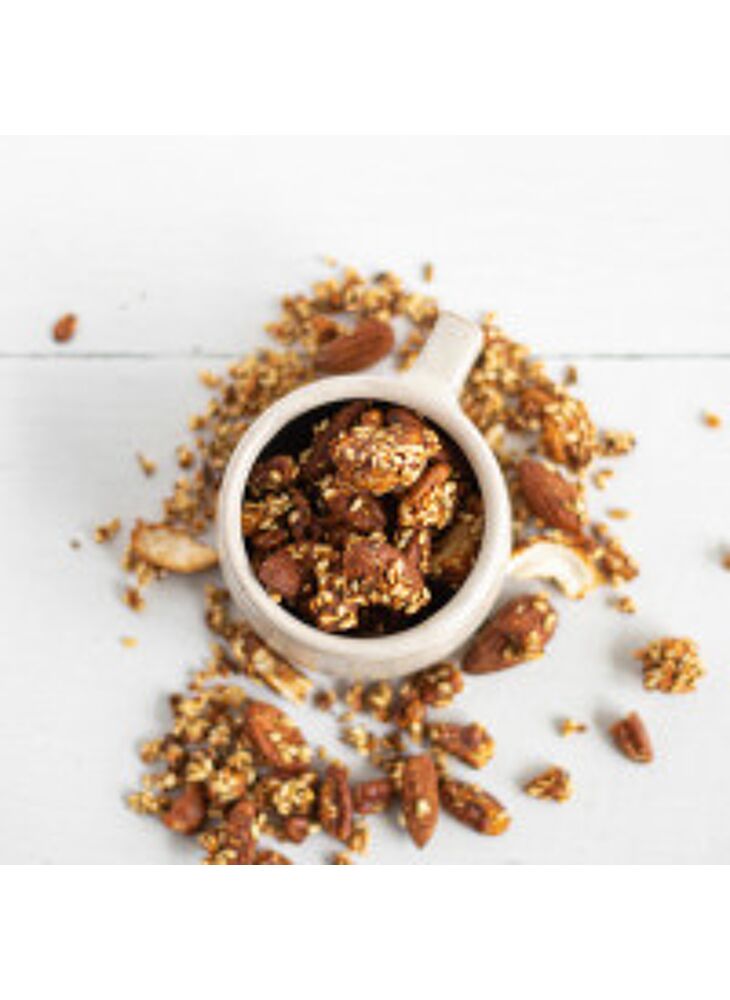 amandelNOTEN, cashewNOTEN, pecanNOTEN, SESAMzaad, ras-el-hanout, agavesiroop, zeezout, EI-eiwit, kruiden. Kan sporen van gluten, soja en selderij bevatten.