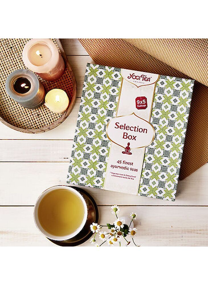De Selection Box bevat in totaal 45 theezakjes, bestaande uit telkens vijf theezakjes van de volgende negen YOGI TEA®-producten: