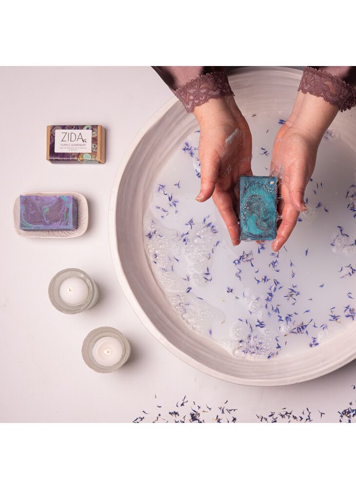 Geef je over aan deze ongelooflijk zachte zeep! Purple surrender ruikt lekker zwoel. Dat heeft de zeep te danken aan geranium en patchoeli. Maar deze zeep koop je niet enkel voor de bedwelmende geur. Ook het verzorgende effect van de avocado-olie is bijzonder overtuigend. Een waar genot voor huid én neus!